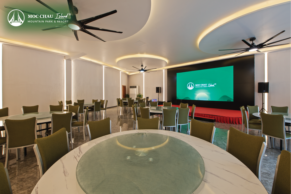 Mộc Châu Island sở hữu hệ thống phòng họp được trang bị âm thanh, máy chiếu và thiết bị trình chiếu hiện đại, đáp ứng linh hoạt nhiều quy mô và hình thức sự kiện. Không gian có thể tùy chỉnh đa dạng setup, phù hợp cho hội nghị chuyên đề, đào tạo nội bộ hay họp chiến lược. Ánh sáng hài hòa cùng tầm nhìn thiên nhiên xanh mát giúp mỗi buổi họp trở nên tập trung nhưng vẫn đầy cảm hứng.
